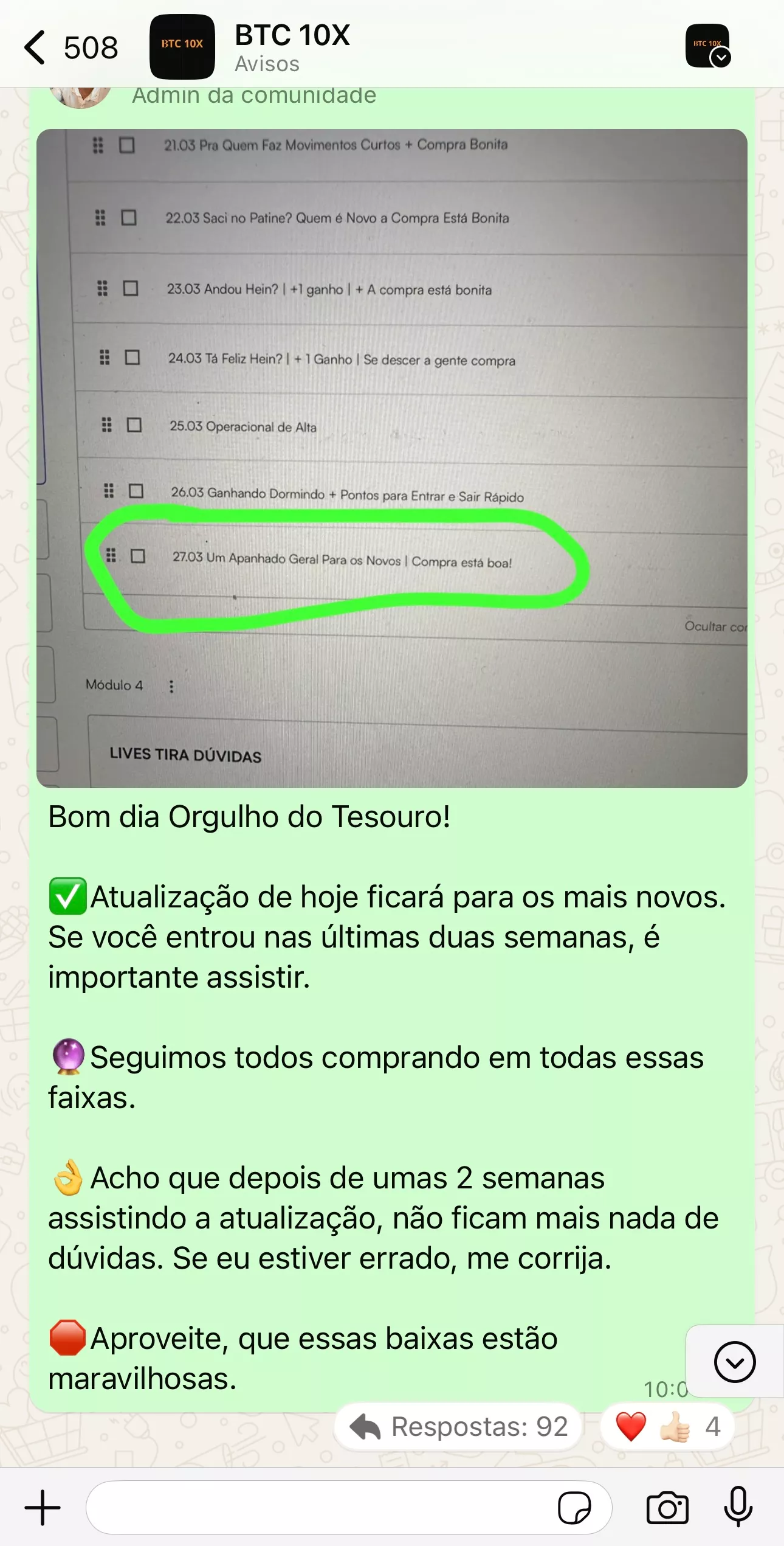 Posto diariamente vídeos de 3 a 10 minutos sobre o mercado, mostrando meus pontos de entrada e operacional na prática.